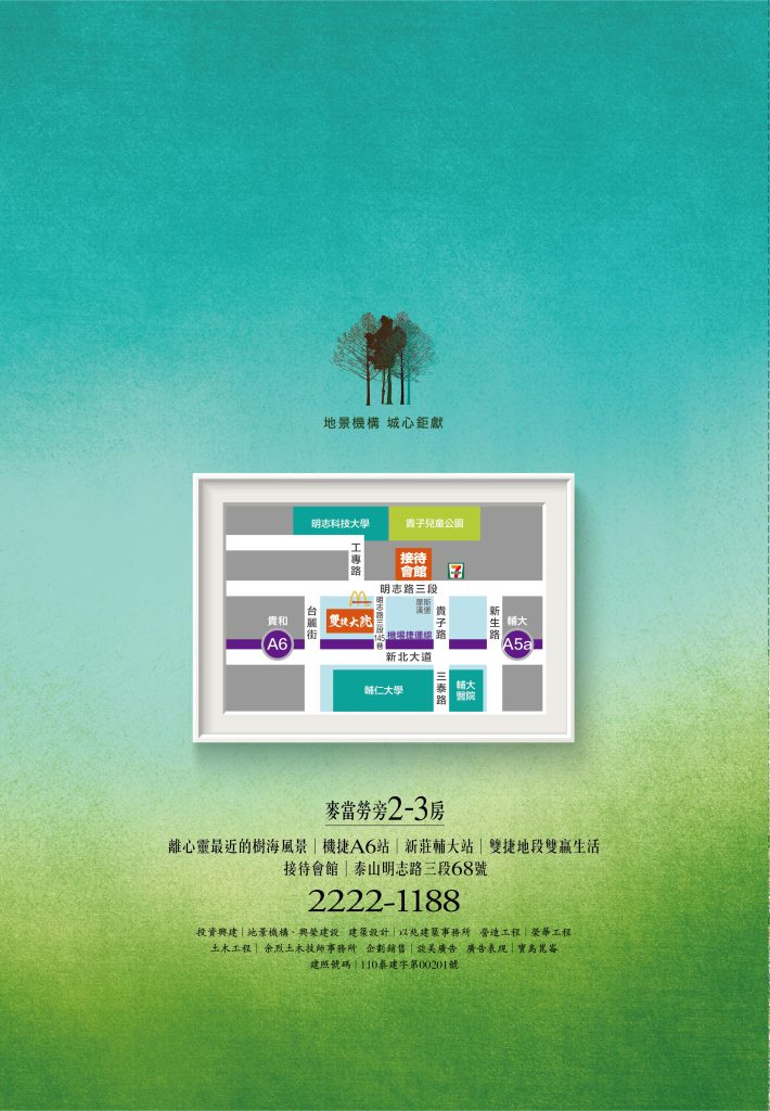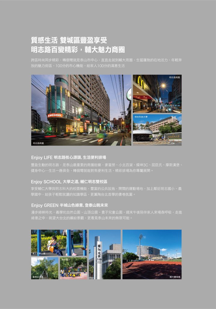 「雙捷大院」位居泰山市區與重劃區的樞紐位置,往來交通要道上,更同時擁有新莊輔大的商圈與生活機能,核心的關鍵地段,增值的未來槓桿。放眼大新泰、贏接大未來,一座值得你改變觀點的城市 – 泰山。