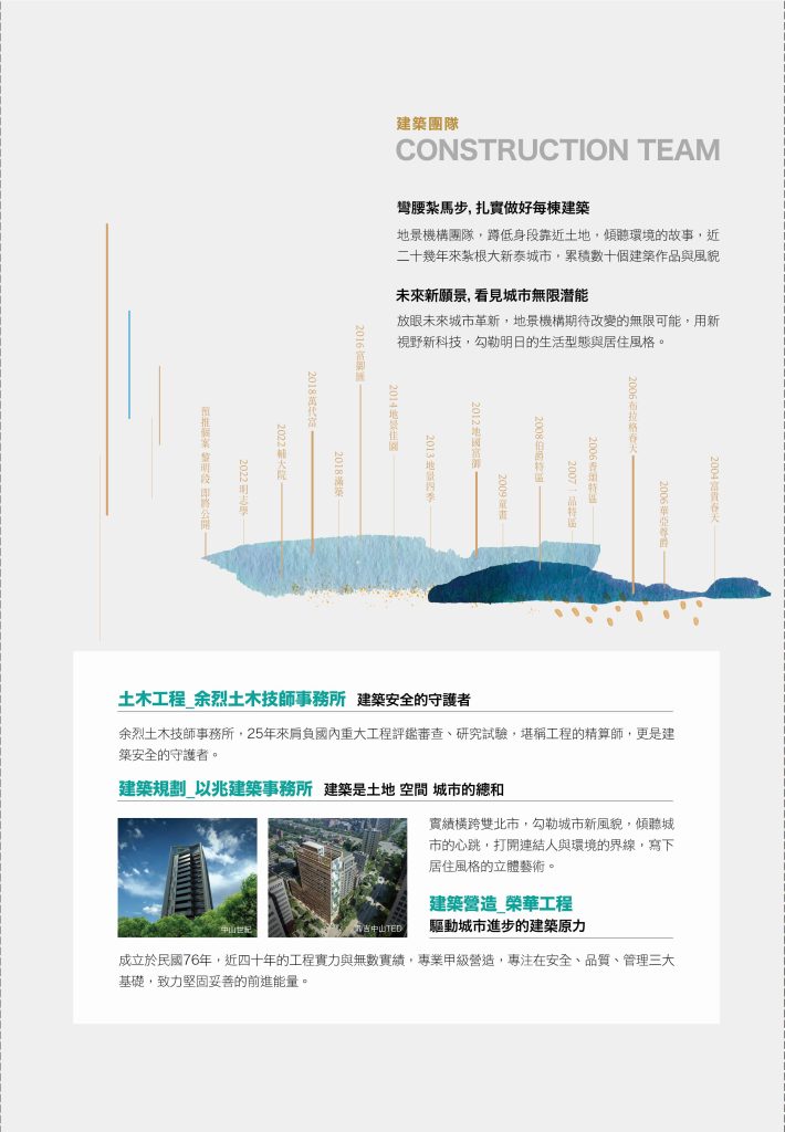 面對未來的生活提案,地景機構邀請以兆建築事物所、余烈土木技師,並特聘榮華工程甲級營造肩負管理工程品質。「雙捷大院」考慮未來城市發展與規劃,設計符合生活想望的質感建築。