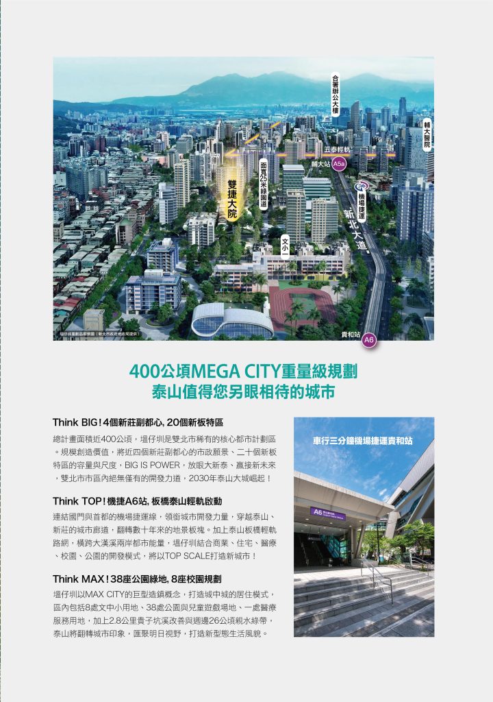 泰山,下一個新北盛世。塭仔圳近400公頃開發計劃,相當於4個新莊副都心、20個新板特區,Think BIG的城市格局,以看齊新莊同步新板的發展願景,擘畫2030年的新北城市大計。